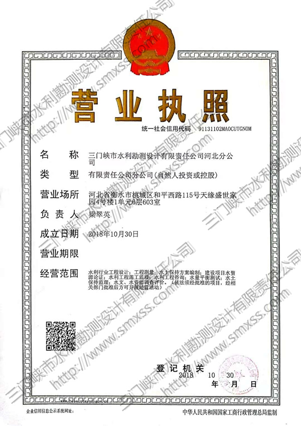 近日,三門(mén)峽市水利勘測(cè)設(shè)計(jì)有限責(zé)任公司河北分公司正式注冊(cè)成立,分公司的成立是我公司進(jìn)一步擴(kuò)大了市場(chǎng)范圍,同時(shí),我司將以真情的合作、優(yōu)質(zhì)的服務(wù)為河北水利建設(shè)發(fā)展做出更多貢獻(xiàn)。