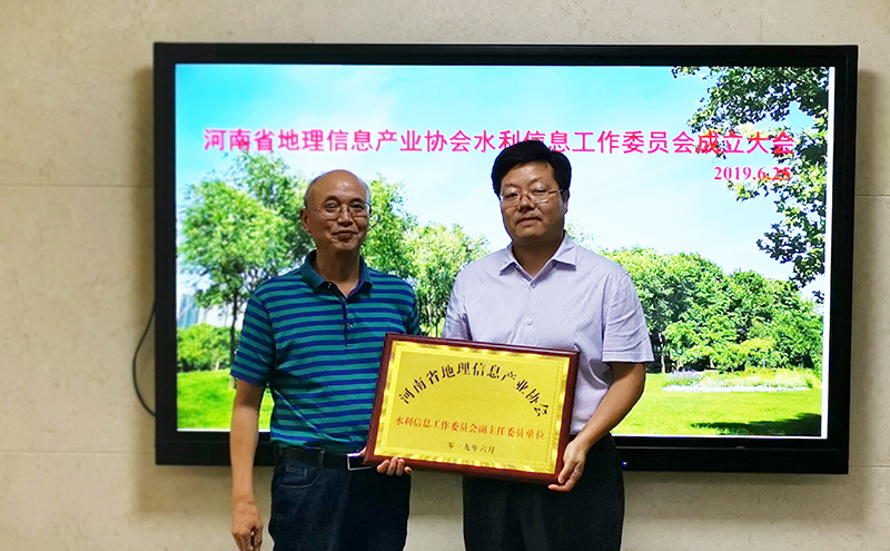 河南省地理信息產業協會鄧月明會長為我公司頒發副主任委員單位標牌