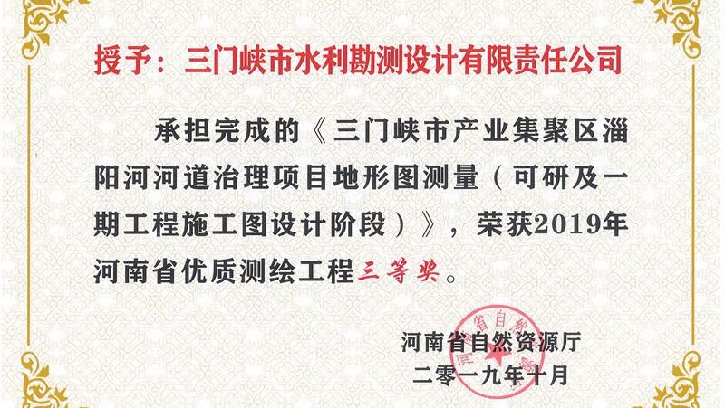 近日,由我公司承擔完成的《三門峽市產業集聚區淄陽河河道治理項目地形圖測量(可研及一期工程施工圖設計階段)》獲2019年河南省優質測繪工程三等獎。