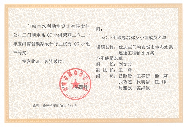 近日,我公司申報課題《優選三門峽市城市生態水系連通工程輸水方案》榮獲2021年度河南省勘察設計行業優秀QC小組三等獎。