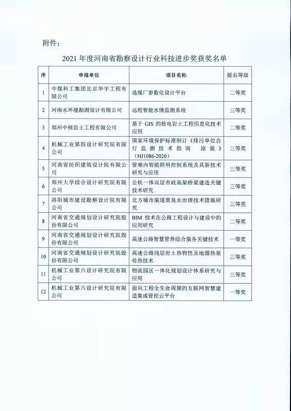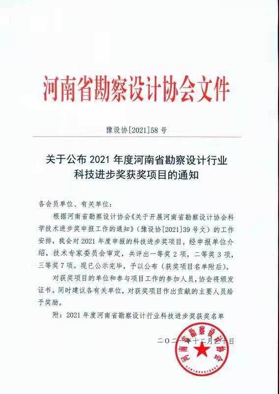 河南省勘察設計協(xié)會近日組織召開了“2021年度河南省勘察設計行業(yè)科技進步獎評會”經(jīng)技術(shù)專家委員會審定,我公司科研項目《遠程智能水情監(jiān)測系統(tǒng)》獲三等獎。