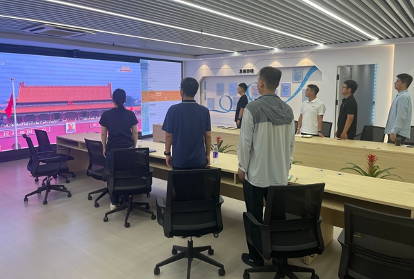 當國旗在屏幕上冉冉升起,全體員工自發起立,跟隨直播齊唱國歌,神情莊嚴肅穆,充滿了對革命先烈的深切緬懷和對祖國的無限熱愛。