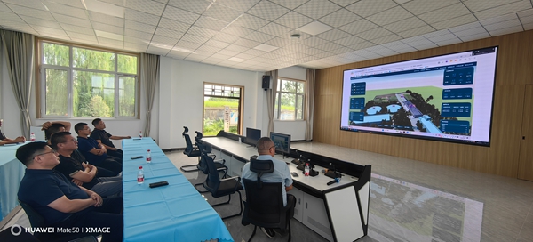 楊永剛董事長一行首先到我司智慧水務創新應用示范基地實地考察參觀,技術總監李雙江就示范基地及公司科技研發、智慧化建設及精準灌溉和精確計量等相關情況作詳細介紹,并在控制大廳觀看了基地數字孿生演示。
