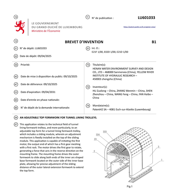 10月9日,我司申報的一項國際發明專利“AN ADJUSTABLE TOP FORMWORK FOR TUNNEL LINING TROLLEYS(關于一種隧道襯砌臺車可調節式頂模)”在盧森堡大公國正式獲批。這是我司首次獲批國際發明專利。