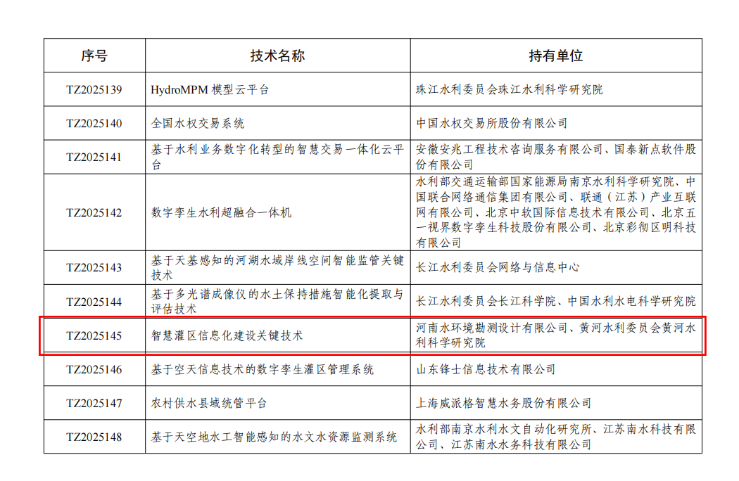 近日,水利部科技推廣中心發布《2025年度水利先進實用技術重點推廣指導目錄》,公司自主研發的“智慧灌區信息化建設關鍵技術”成功入選。