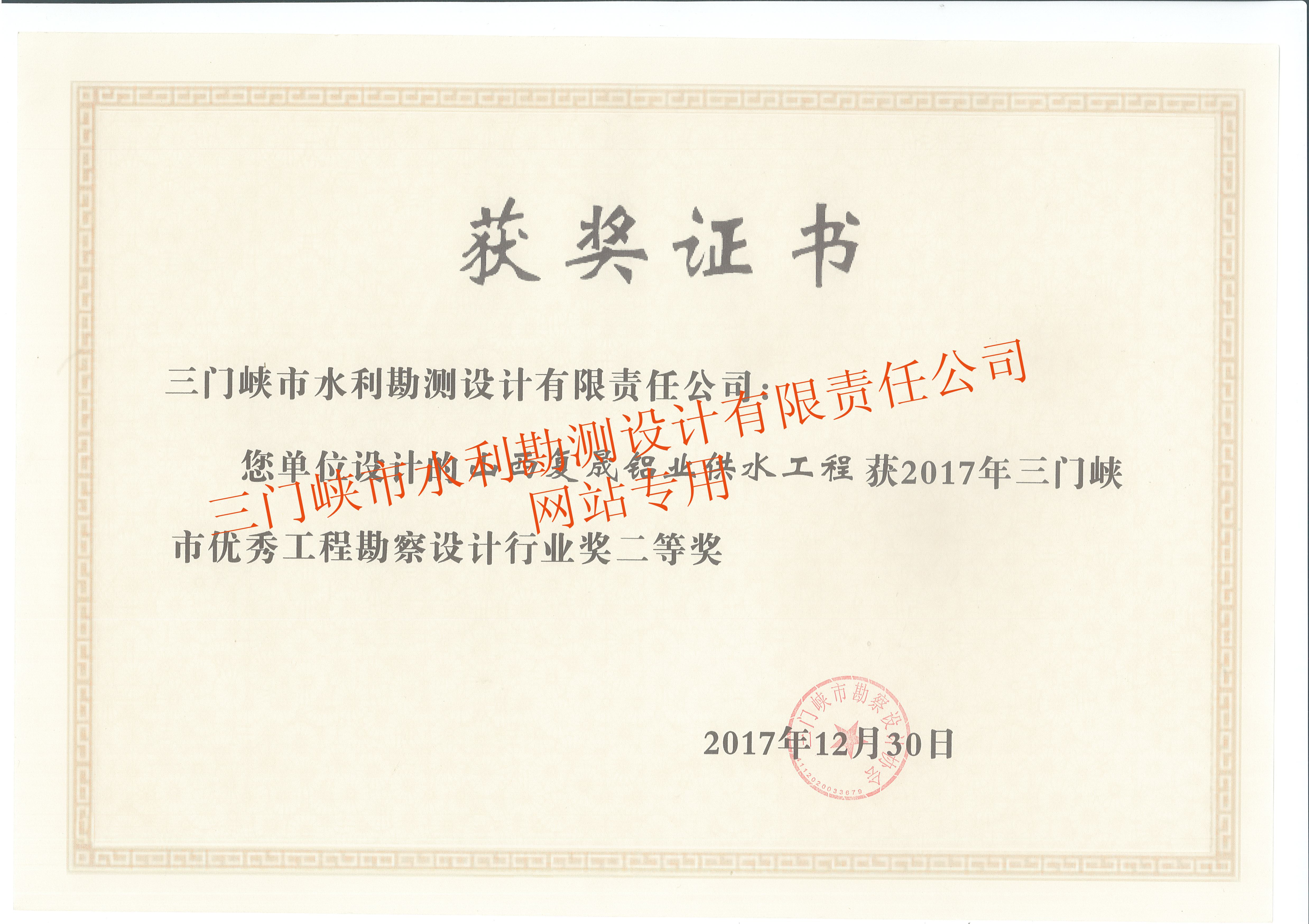 山西復晟鋁業(yè)供水工程獲市優(yōu)秀工程勘察設計行業(yè)獎二等獎